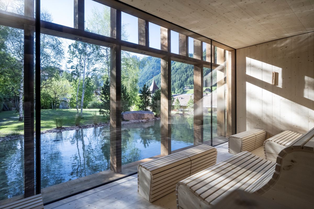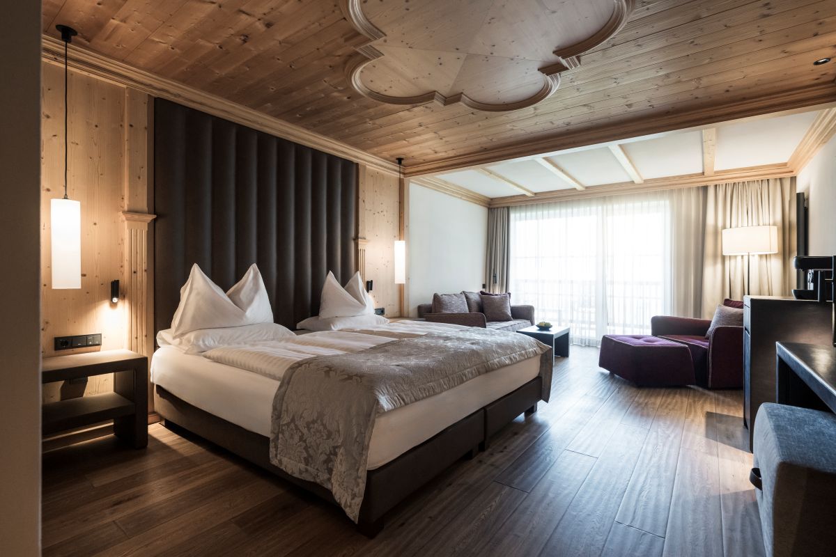 Guests stay in 30 elegantly designed Junior Suites, crafted from untreated wood, each featuring a private balcony with panoramic views of Ortisei and the Dolomites – creating a warm, serene atmosphere.